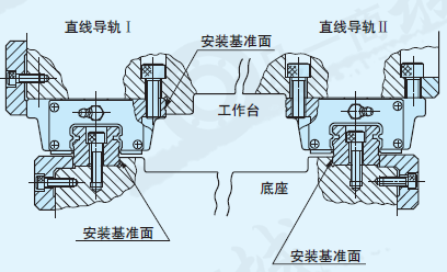 當需要直線運動的精度和剛性時,可設(shè)2處底座安裝基準面,1處工作臺安裝基準面,并按照下面的步驟安裝直線導軌。