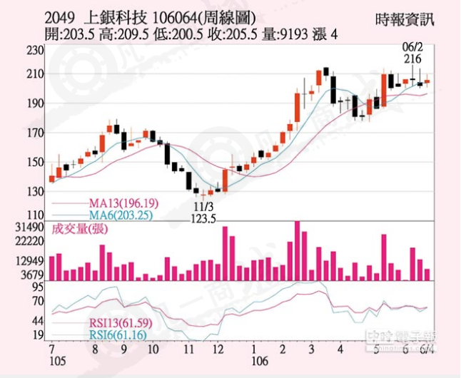 上銀(2049)滾珠絲桿、直線導軌及機器人三大主力商品年底前訂單滿載,法人預期,第2季合并營收挑戰(zhàn)50億元,6月新臺幣匯率回貶,第2季營收及獲利可望優(yōu)于第1季,三大法人上周五合計買超397張,激勵股價上漲1元、收205.5元,單周漲幅1.99%。