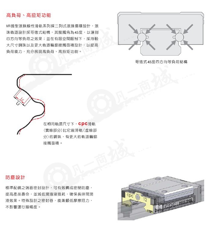CPC直線導軌為一種滾動導引,借由鋼珠在滑塊與滑軌之間作無限滾動循環,負載平臺能沿著滑軌輕易地以高精度作線性運動。再加上滑塊與滑軌間的束制單元設計,使得CPC直線導軌可同時承受上下左右等各方向的負荷,上述陳列特點并非傳統滑動導引所能比擬,因此機臺若能配合滾珠螺桿,使用CPC直線導軌作導引,必能大幅提高設備精度與機械效能。與傳統的滑動導引相較,滾動導引的摩擦系數可降低至原來的1/50,由于起動的摩擦力大大減少,相對的較少無效運動發生,故能輕易達到μm級進給及定位。