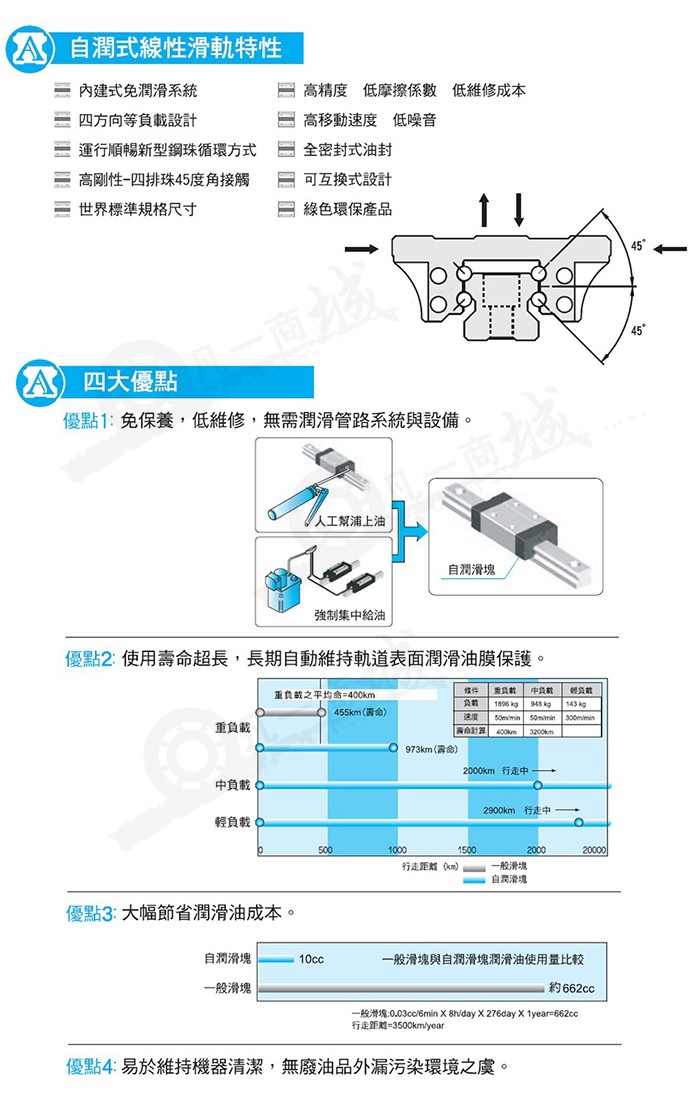 磨耗少能長時間維持精度傳統的滑動導引,無可避免的會因油膩逆流作用造成平臺運動精度不良,且因運動時潤滑不充分,導致運行軌道接觸面的磨損,嚴重影響精度。而滾動導引的磨耗非常小,故機臺能長時間維持精度。
