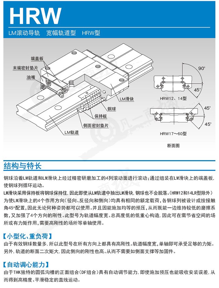LM滑塊采用保持板精鋼球保持住,因此即使從,LM軌道中抽出來LM滑塊也不會脫落。(HRW12和14LR型除外)
