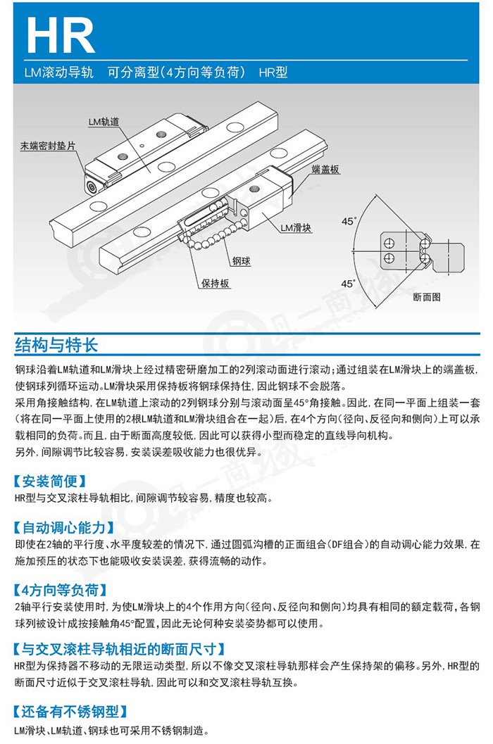 采用角接觸結構,在LM軌道上滾動的2列鋼球分別與滾動面呈45度角接觸。因此,在同一平面上組裝一套(將在同一面面上使用的2根LM軌道和LM滑塊組合在一起)后,在4個方向(徑向、反徑向和側向)上可以承載相同的負荷。而且,由于斷面高度較低,因此可以獲得小型而穩定的直線導向機構。另外,予壓調節比較容易,安裝誤差吸收能力也很優異。